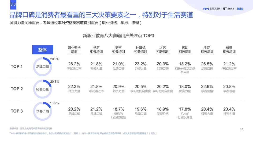 腾讯营销洞察(TMI)相关数据显示,品牌口碑是消费者最看重的三大决策要素之一,社交平台在绝大多数赛道的作用举足轻重,才艺、运动、生活类培训相对更受圈层影响,进一步凸显社交优势。此外,生活、修理、语言赛道从众心理强,适合圈层营销和品牌知名度建设助力口碑效应。基于腾讯营销大数据识别各赛道目标受众,基本都是促销敏感,特别是职业资格和运动赛道,和才艺赛道一样都热衷推荐,可考虑依托社交裂变优势。