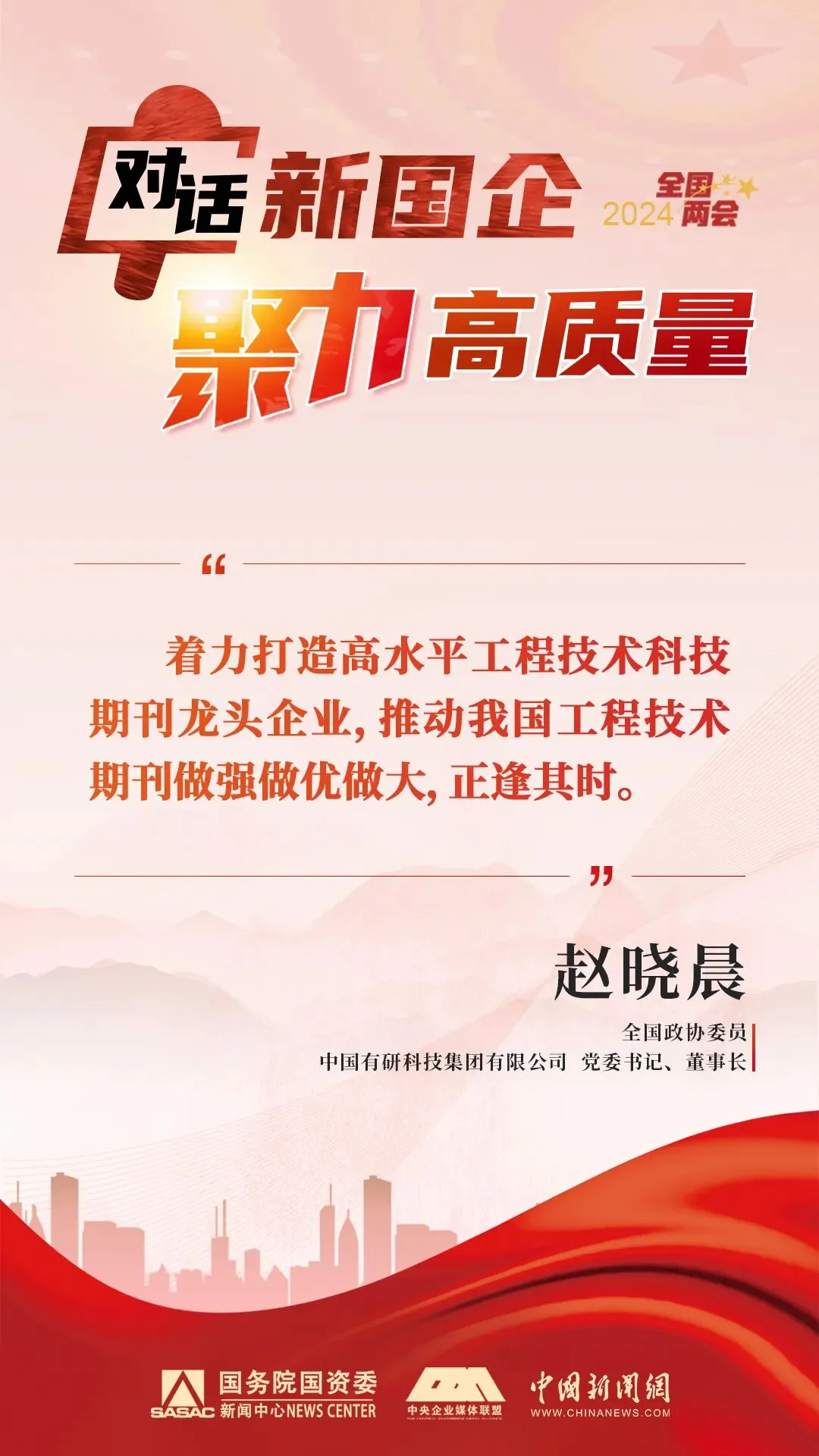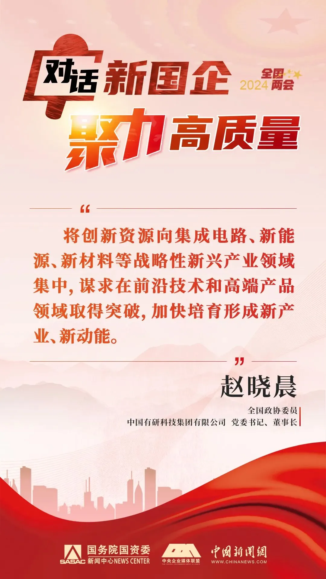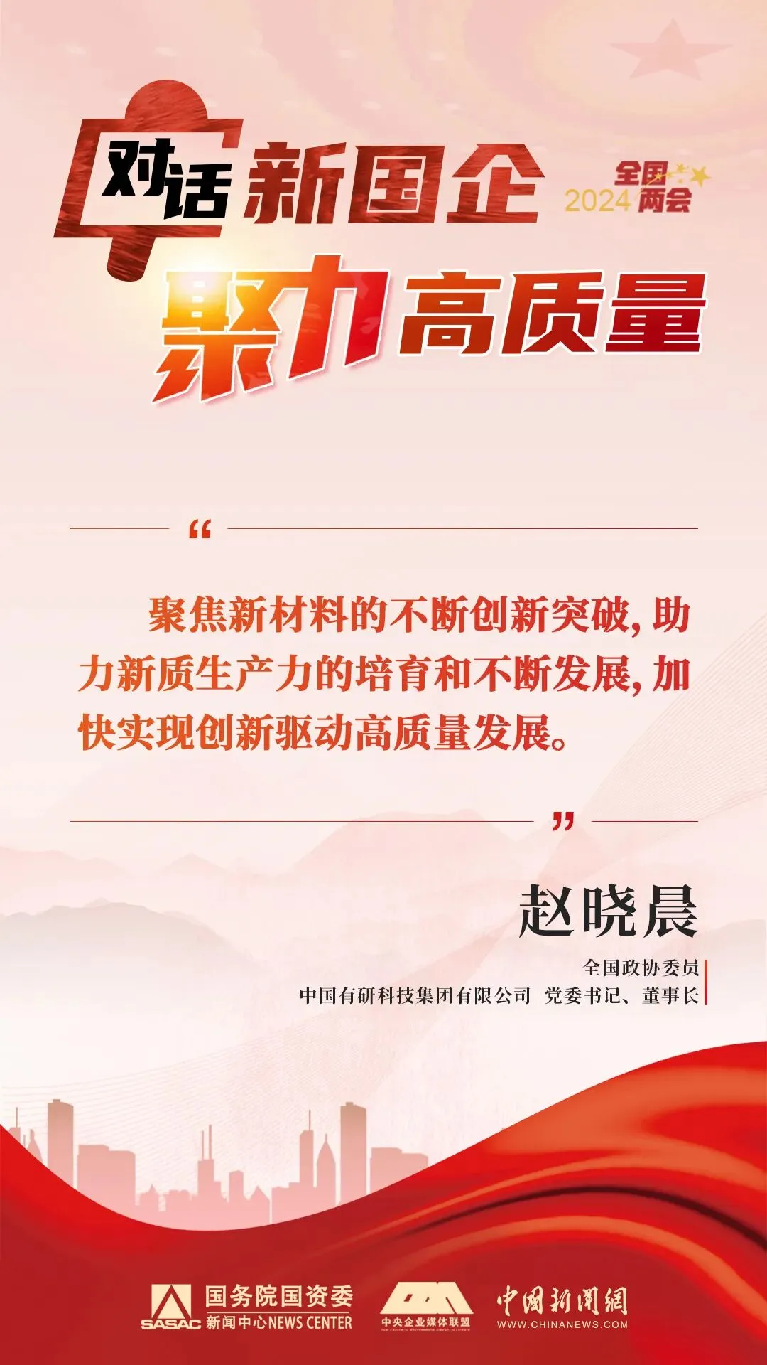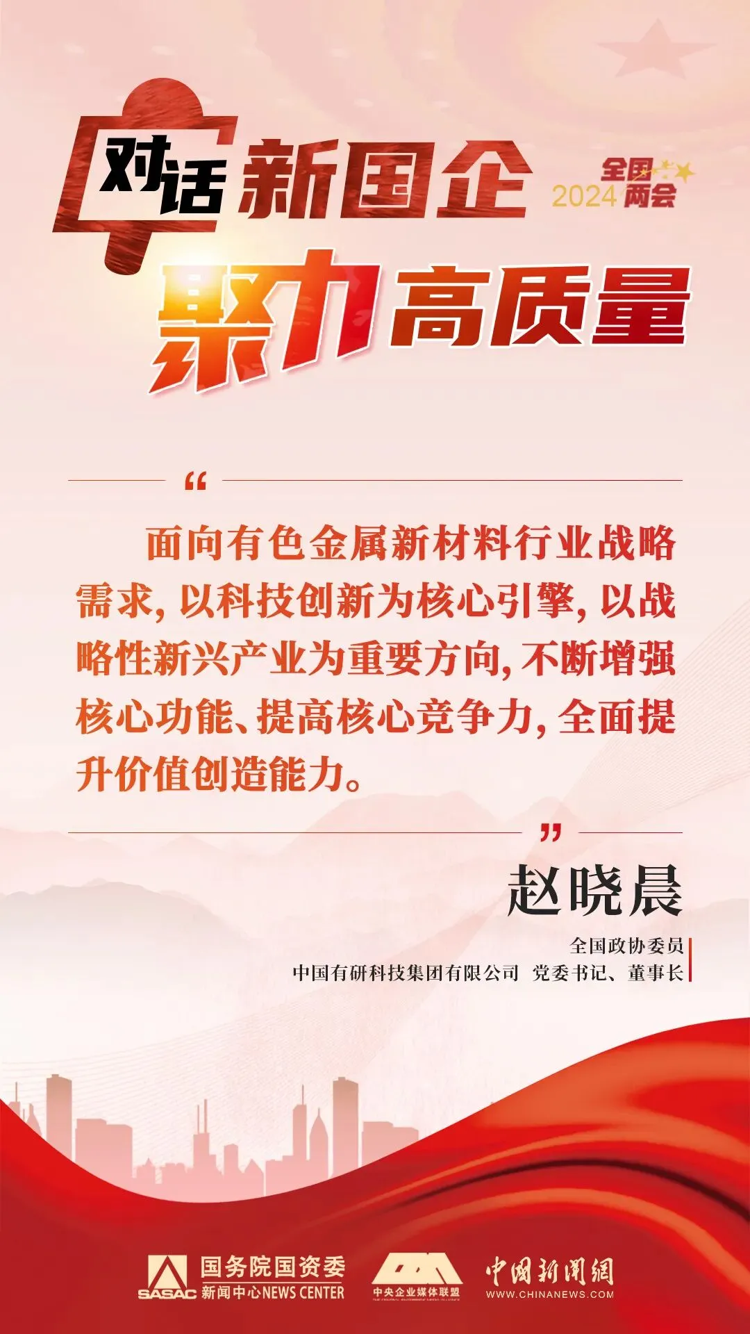 “对话新国企·聚力高质量”系列融媒体访谈由国务院国资委宣传工作局指导,国务院国资委新闻中心与中央企业媒体联盟主办,中国新闻网联合主办。谈及目前热议的“新质生产力”话题,赵晓晨表示,科技创新是发展新质生产力的核心要素。而聚焦到行业内部,他认为,新材料的发展能极大地促进新质生产力的发展,新质生产力的不断形成,新产业、新业态的蓬勃兴起,又为新材料的发展开辟更为广阔的空间。抓住当前机遇的关键,是以新材料的创新突破,促进新质生产力培育和形成。他表示,在“加快关键核心技术突破,提升关键产业链供应链韧性和安全水平”方面,作为科研转制院所中央企业,要发挥自身科技创新和拥有战略科学家资源的优势,围绕像稀土、半导体集成电路等重点产业链,系统梳理和部署创新链,加快锻长板、补短板,在新型举国体制中,发挥好行业国家队关键核心技术“保供”和“托底”的作用,下定决心、加大力度,加快实现关键核心技术突破,保证国家重点产业链安全可靠、有竞争力。在“强化前沿技术布局,培育发展新质生产力的新动能”方面,坚持竞争点前移,超前布局、超前投入,以率先实现前沿技术突破,引领培育发展战略性新兴产业和未来产业,在新能源、新材料等新领域、新赛道实现关键突破、奠定竞争优势,以新兴产业发展引领新质生产力形成,培育企业发展新动能。在“加大行业共性技术供给,赋能传统产业升级迭代”方面,致力于迭代升级传统的有色金属行业,大力开发、推广短流程、低能耗、可循环等绿色制造技术,推动形成绿色生产方式和循环经济模式;同时,加快数智技术与传统产业融合,利用人工智能、大数据等新一代信息技术赋能传统产业,全面提升资源配置效率、行业创新水平和竞争能力。国资央企的核心功能主要体现在增强国有经济主导作用和战略支撑作用上,核心竞争力主要体现为持续创新能力和价值创造能力。谈及企业的发展定位,赵晓晨说,中国有研科技集团作为科技型中央企业,聚焦核心功能和核心竞争力、提升价值创造能力的途径,就是要坚持“科技创新服务和产业培育孵化”的发展定位,围绕服务国家战略增强核心功能、围绕价值创造提高企业核心竞争力。他强调,首先是企业要全面系统打造价值创造的“关键引擎”。体现强化核心功能,全力推动重点领域的科技攻关,服务国家、行业大局,不断破解“卡脖子”难题;体现增强核心竞争力,加快构建以实效为导向的科技创新体系,不断完善科技成果转化运用体系,不断提升工程技术创新体系效能。其次是不断优化价值创造的“产业结构”。将创新资源向集成电路、新能源、新材料等战略性新兴产业领域集中,努力提高投入产出效率,谋求在前沿技术和高端产品领域取得突破,加快培育形成新产业、新动能;持续优化调整产业结构,促进传统产业向高端化、智能化、绿色化转型,为行业高质量发展注入新动能;紧跟全球科技和产业变革发展趋势,坚持以科技创新引领产业创新,系统谋划和布局战略性新兴产业。最后是全面提升价值创造的“整体能力”。通过深入开展对标提升行动、落实改革深化提升三年行动方案、全面加强精益管理、推进数智化赋能,等等,坚定不移地提高经营管理水平和运营质量,全面提升企业价值创造能力。发展新质生产力要做好“人才”文章。赵晓晨说,中国有研作为行业“国家队”,在有色金属工程技术领域,应当既是科技创新的主力军,也是人才培养的先锋队。在赵晓晨看来,首先,大事要党委来抓,人才工作是战略任务,党委要统筹人才工作。党委在人才工作中发挥“把方向、管大局、保落实”作用,要对人才现状、建设需求作出战略判断,做好顶层设计和系统谋划,旗帜鲜明的树立“人才引领发展”战略导向,营造识才爱才敬才用才的环境。其次,科技人才是人才中的重中之重,要坚持科技创新和人才发展深度融合、一体推进,聚焦创新抓人才。围绕科技创新技术发展格局,梳理核心领域、重要方向,精准绘制科技人才地图,聚焦科技创新目标任务,打造战略科技人才雁阵格局。依托重大项目培养人才,在国家重大战略任务和关键核心技术攻关,在锻长板、补短板的实践中,精准发现、培养高层次人才。“还有一点是,要坚持人才是第一资源,充分激发人才创新活力动力。”赵晓晨认为,对科技人才,对科技人才的价值贡献,要坚持正向激励为主、能给尽给。完善以增加知识价值为导向的科技创新奖励体系,根据不同类型、不同发展阶段的企业特点,分类实施股权激励、分红激励、超额利润分享等中长期激励措施,充分向作出突出贡献的一线科技人才倾斜,有效激发科技人才参与科技创新的活力动力。“总体来说,人才工作是一项系统工程,关键是落实人才建设的战略地位,坚持科技创新和人才培养一体谋划、一体推进,持续、精准完善人才战略布局,以高水平的战略人才力量建设成果,助力加快打造国家战略科技力量。”一直以来,全国两会期间代表委员的建议和提案都备受外界关注。今年,赵晓晨带来的提案是“着力打造中国工程技术科技期刊龙头企业”。“我理解,工程技术科技期刊,对引领科技创新、推动科技成果工程化转化应用,具有重要的作用,工程技术期刊的发展水平,也在一定程度上,反映一个国家在工程技术创新方面的实力和竞