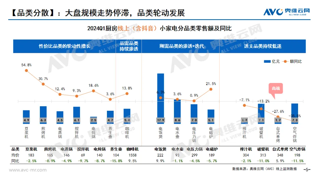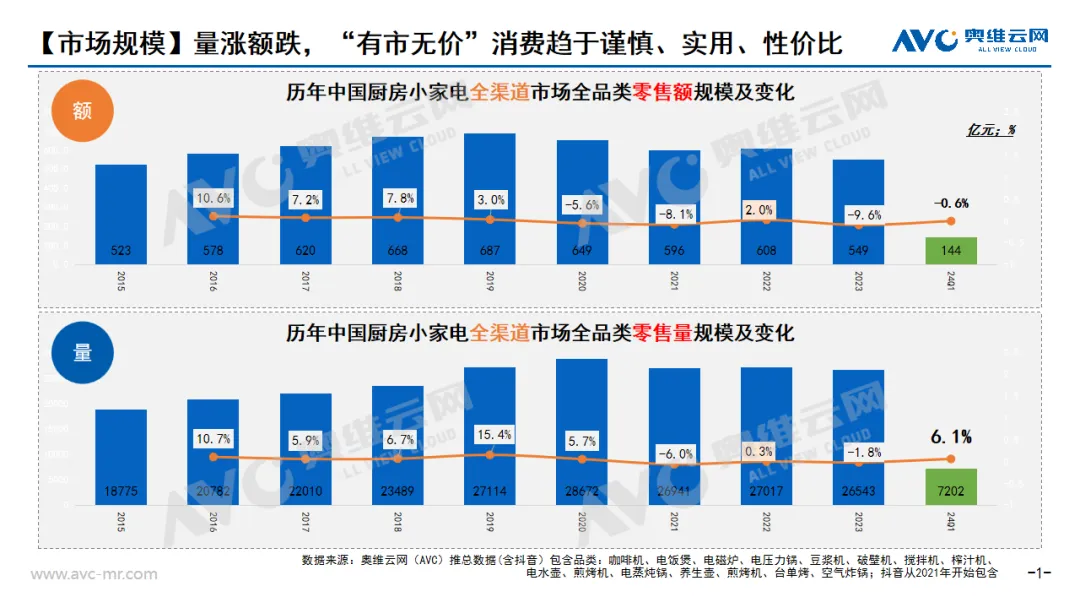 2024年一季度落下帷幕,小家电行业在“风雨飘摇”中表现出较强韧性,奥维云网(AVC)2024年一季度全渠道推总数据显示,厨房小家电(包含品类:咖啡机、电饭煲、电磁炉、电压力锅、豆浆机、破壁机、搅拌机、榨汁机、电水壶、煎烤机、电蒸炖锅、养生壶、煎烤机、台式单功能小烤箱、空气炸锅)整体零售额144亿元,同比下降0.6%;零售量7202万台,同比上涨6.1%;均价200元,同比下降6.3%。戳→奥维数据罗盘受到近年来环境影响,贫富差距在我国改善,进度相对不佳,高收入群体钱多没处花,中高收入群体有钱不愿花,而对于中低收入的群体钱少不敢花,最后对于低收入群体而言则是无钱可以花,故而言之在2024年来看,我们会发现消费者对于性价比的极致追求相比2023年展现的更为淋漓尽致。从而从整个小家电行业来看会呈现均价大幅下跌的情况。