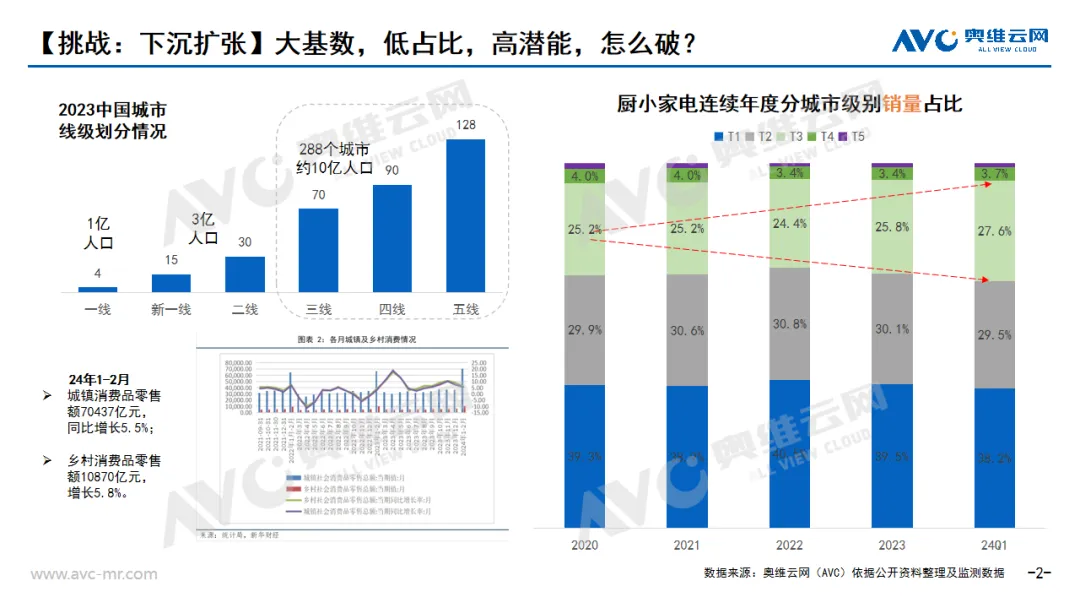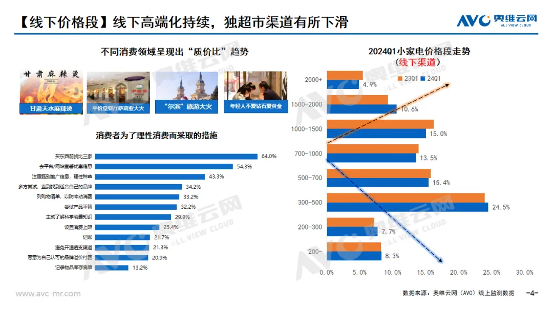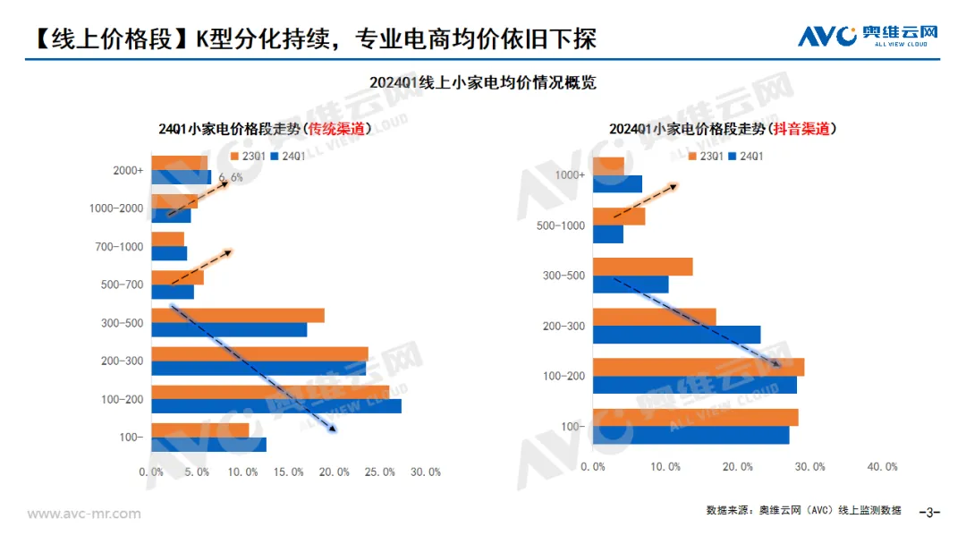 奥维云网(AVC)一季度推总数据显示,从整体线上/线下结构占比来看,线上占比达78%,相对2023年结构占比提升1个点。考虑到去年同期线下,线下消费放开,故而对线下占比有一定影响后期会有所改善。从分渠道来看,社交电商依旧表现优势,占比提升,但增幅有所收窄。我们按照2023年中国城市级别划分来看,288个城市,约10亿的人口集聚在我国的三四五线。据相关公开数据展示城镇消费品零售额70437亿元,同比增长5.5%;乡村消费品零售额10870亿元,增长5.8%。故而大体量市场的消费能力的增强,会成为日渐需求提升的主要销售渠道,此外据奥维云网(AVC)一季度线下监测数据中也能看到连续年度三、四级市场的份额也是在不断提升的。从需求端来看,小镇及农村市场的消费者的产品需求也一定有差异化,也需要品牌去做产品的差异化对标。戳→奥维数据罗盘由于大环境影响,消费需求整体趋于保守,从奥维云网(AVC)一季度监测数据中我们看到,整体价格段呈现明显的K型分化,高端部分小幅度增加,保持高端份额稳定。而对于中低端部分,会看到明显的由中端向中低端结构下移的趋势,性价比成为行业的主流趋势。此外在我们监测的线下数据中也同样发现,中端下移的明显现象,从火热的甘肃天水麻辣烫、平价意餐厅、萨莉亚大火等现象也可以看出目前消费者无论是在家电还是在餐饮方面的偏好也都在向经济实惠的方向去转移。