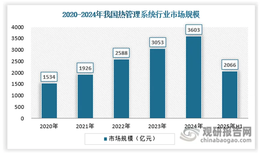 近年来以新能源汽车和数据中心为代表的高成长驱动行业快速发展,带动了我国热管理系统行业的高速发展,截止2024年我国热管理系统市场规模达到3603亿元,2025年上半年市场规模约为2066亿元。