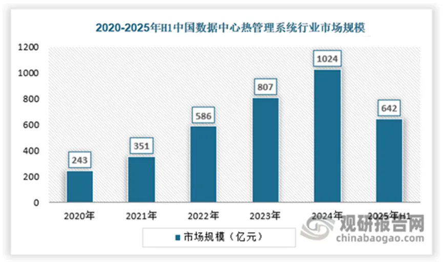 根据相关数据显示,2024年我国数据中心热管理系统市场规模达到1024亿元,突破千亿规模,2025年上半年市场规模约为642亿元。