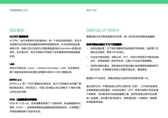 保险 API 标准化:已进入 "采用" 阶段,通过统一数据交换格式,打破保险公司、经纪人、再保险公司之间的信息壁垒,提升效率并降低成本。例如,ACORD、LMA 等组织正推动行业数据标准统一。