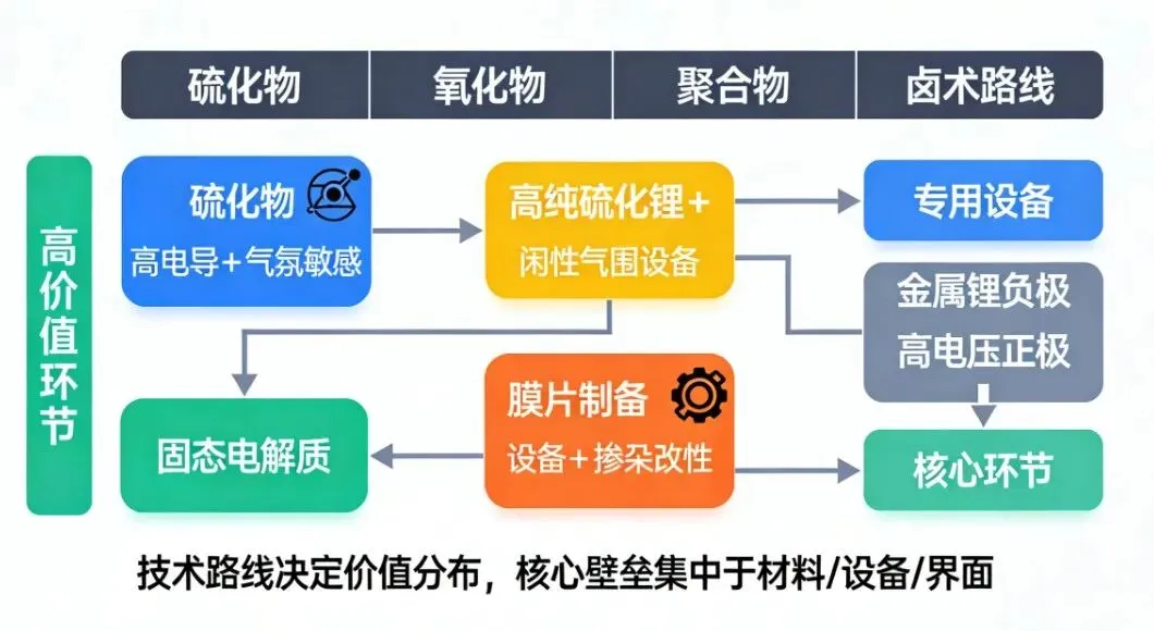 在固态电池领域,选择哪条技术路线,本质上决定了产业链的价值重心落在何处。例如,硫化物路线因对空气极度敏感,催生了对惰性气氛设备和高纯前驱体的需求;而氧化物路线因需高温烧结,增加了对陶瓷薄膜制备与界面工程的依赖。因此,技术路径与产业链核心环节的关系,是识别高价值赛道的前提。