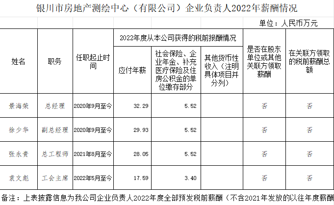 ,现将银川市房地产测绘中心(有限公司)企业负责人 2022 年薪酬情况予以公开。