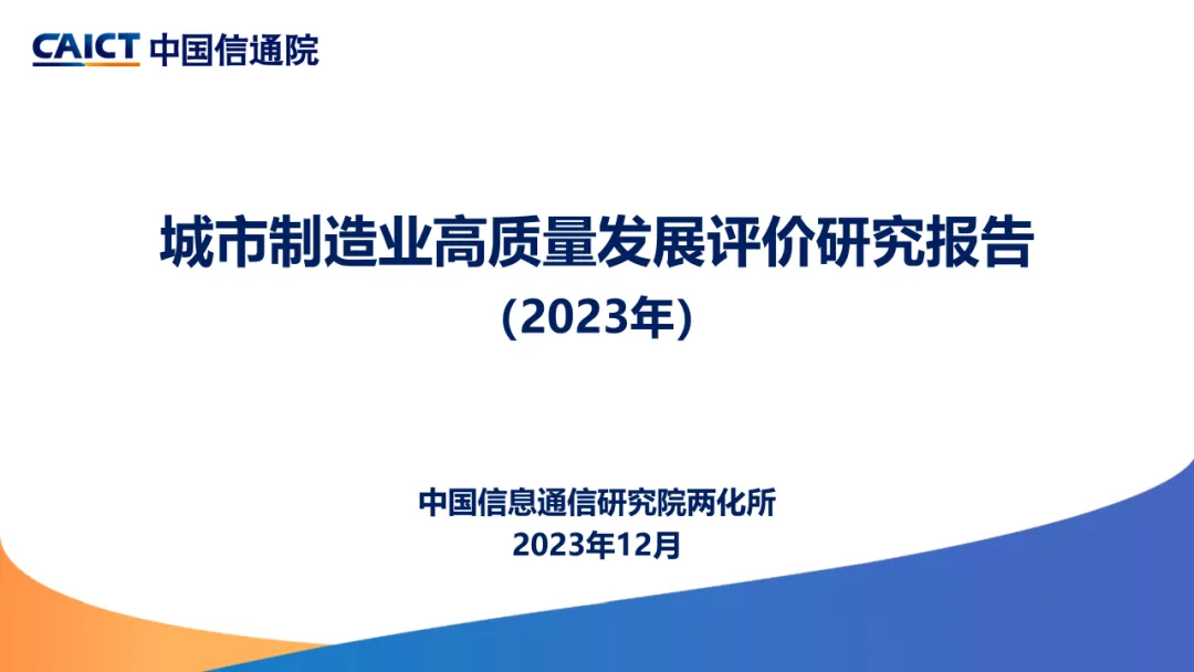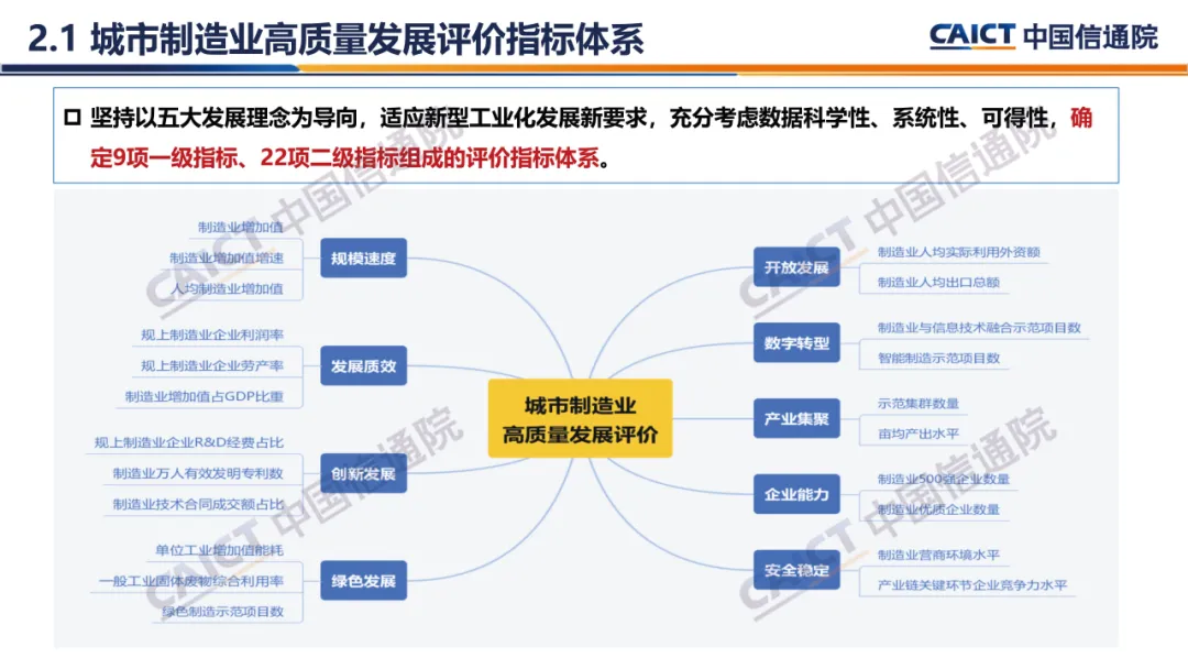 开展城市制造业高质量发展评价,有助于通过综合运用评价指标“指挥棒”和评价结果“体检表”作用,引导城市转变制造业发展理念、加快制造业创新升级,推动加快形成一批具有全球影响力的制造业城市乃至城市群。基于此,中国信息通信研究院信息化与工业化融合研究所连续两年组织开展城市制造业高质量发展评估工作,坚持以五大发展理念为导向,结合新型工业化发展新要求,充分考虑数据科学性、系统性、可得性,主要沿用2022年城市制造业高质量发展评价指标体系,对全国地级城市制造业发展情况进行了综合评价,编制发布《城市制造业高质量发展评价研究报告(2023年)》。
