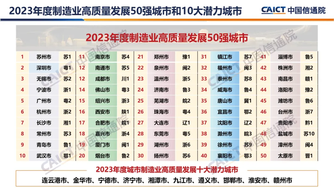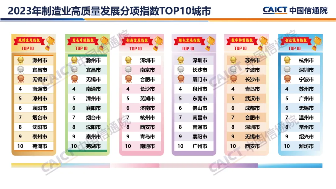 2. 制造业高质量发展十强城市(2023年):苏州市、深圳市、无锡市、宁波市、广州市、杭州市、长沙市、常州市、青岛市和武汉市,苏州市、深圳市连续两年蝉联冠亚军,常州市、武汉市首次上榜前十。