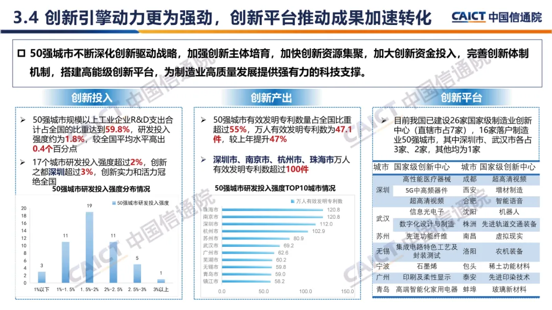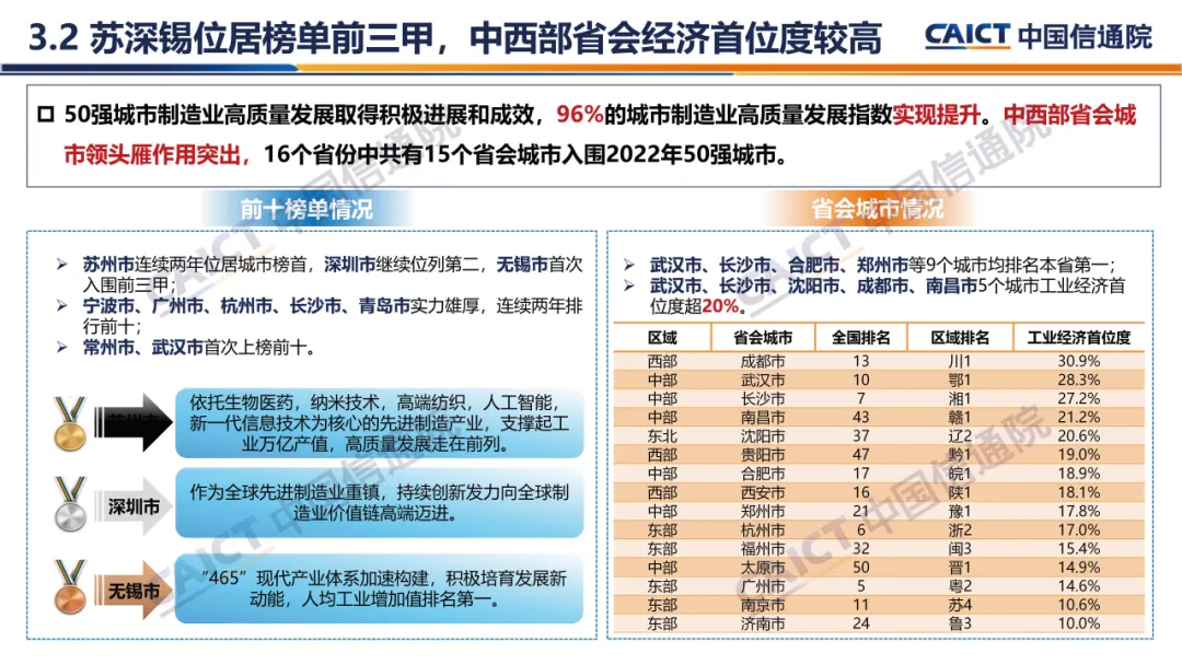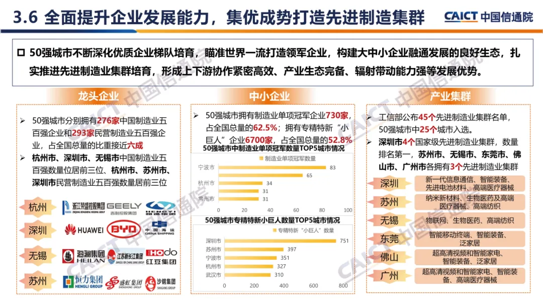 3. 制造业高质量发展50强城市主要特征:东部地区保持领先优势,苏浙鲁粤制造强省实力突出,苏深锡位居榜单前三甲,中西部省会经济首位度较高。入选城市夯实工业经济发展基础,量质双升不断增强发展效能;创新引擎动力更为强劲,依托创新平台推动成果加速转化;转型升级步伐持续加快,绿色化智能化激活内生动力;全面提升企业发展能力,集优成势打造先进制造集群。