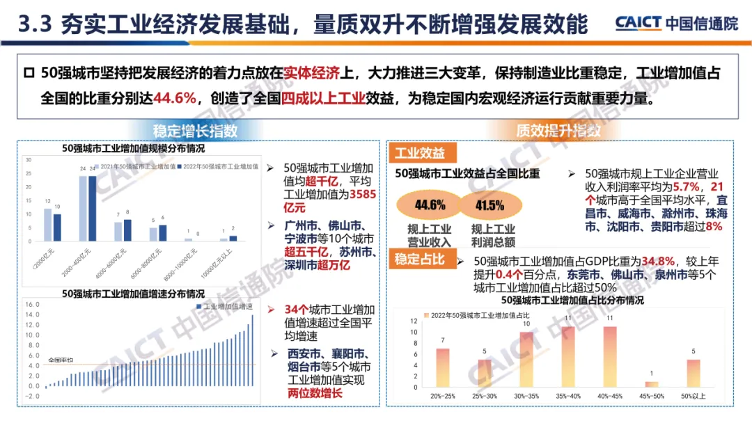 报告凝练了重点城市深耕制造业、推动高质量发展的典型做法及取得的突出成效,评估选出2023年全国制造业高质量发展50强城市和10个潜力城市,树立城市发展标杆,研究分析了50强城市的分布特征、发展特点、分项表现,深度剖析城市高质量发展中存在的问题,提出城市推进制造业高质量发展的有关举措建议,力图为全国各城市推进制造业高质量发展提供参考样板。