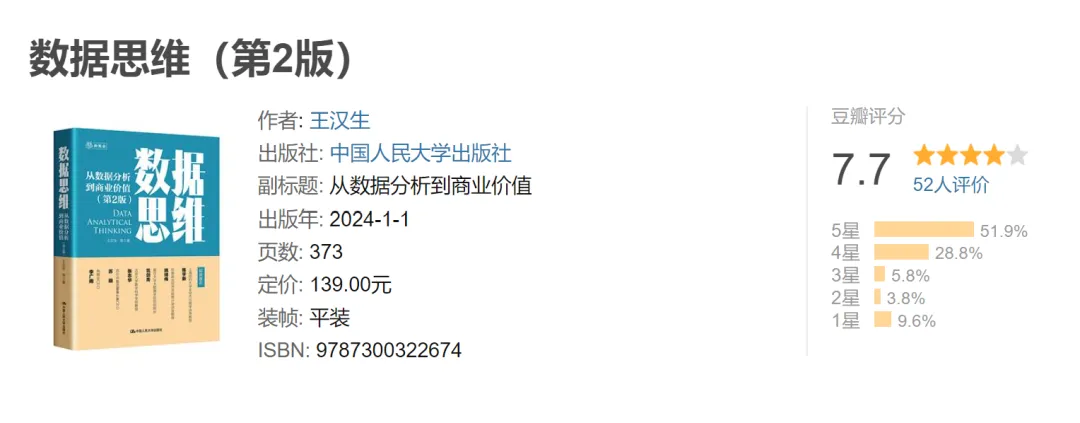 《数据思维:从数据分析到商业价值》由北京大学光华管理学院王汉生教授及其团队撰写,是商业分析领域的入门级通俗读物。