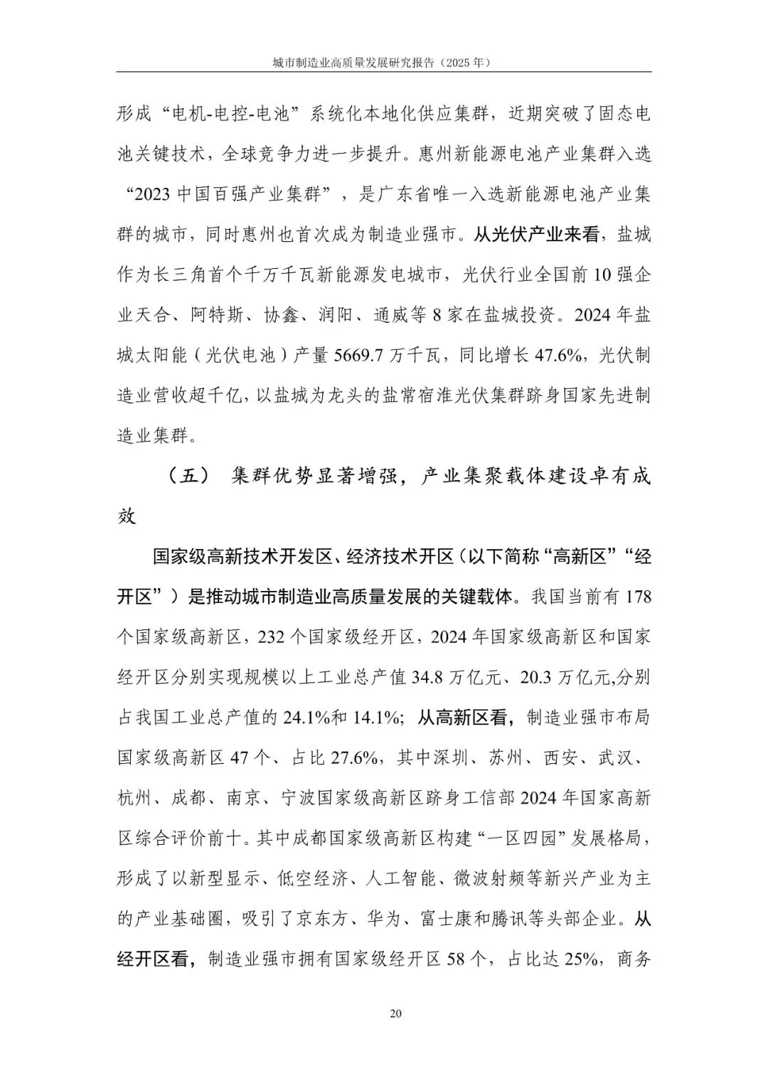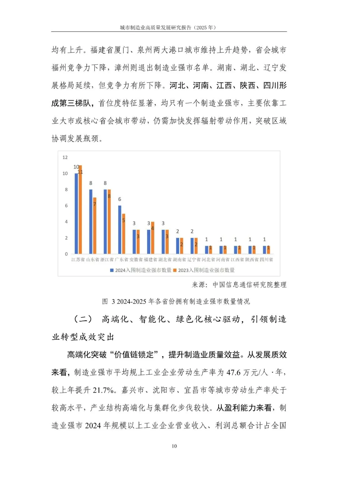 制造业高质量发展进入创新驱动新阶段,智能化、绿色化、融合化成为产业升级新方向,城市作为创新策源地,引领作用越发凸显。研究显示,我国制造业强市区域分布格局相对稳定,东部持续领跑,中部局部崛起,西部单点突破,东北转型承压。这些城市以高端化、智能化、绿色化为核心驱动,科技创新与产业革新加速,集群优势显著增强,龙头企业发挥领航作用,大中小企业形成合力。