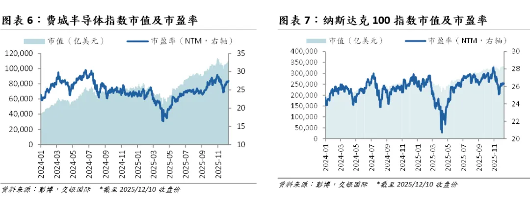 最近一个月,全球科技指数表现呈现分化。统计11月11日至12月10日,MSCI信息科技指数涨0.5%,小幅跑赢MSCI全球指数(+0.3%)。A股Wind信息技术指数逆势涨2.8%,成为同期全行业指数中唯一实现正收益的板块,而沪深300同期则录得1.3%的跌幅。摩尔线程上市后市场反应积极。港股市场或受外部波动影响,恒生指数跌4.3%;恒生科技指数跌5.8%,跌幅仅次于以大型互联网企业为核心成分的恒生传媒指数。估值方面,美股科技股估值在11月下旬普遍下跌后有所反弹,我们认为这一波动或主要来自美联储降息预期的不确定性以及对AI泡沫的市场讨论。A股申万电子/申万半导体指数市盈率均有所回升。