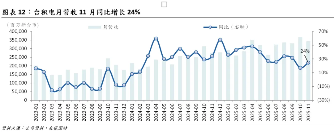 台积电2025年11月营收3,436亿新台币,同比增24%,环比降6%。我们认为先进制程/先进封装产能或继续在2026年供不应求。2nm制程或在4Q25开始上市,而1.6nm制程产品或在2H26上市。我们维持之前的观点,即与之前周期相比,台积电相较于下游客户的议价能力或在提高。2nm及1.6nm工艺节点上市,或不意味着3/5nm产品将降价。