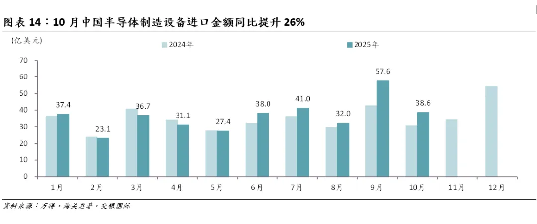 根据海关总署数据,10月我国半导体制造设备进口额为38.6亿美元,同比增长26%,连续5个月取得较为明显的同比增长。我们维持此前预测,预计中国内地半导体设备市场2025年520 亿美元市场规模(同比增长5%)。考虑到我国半导体行业依然处于建设阶段,我们继续看好中国内地半导体设备的投资前景并维持2026年市场规模较2025年继续增长4.2%到542亿美元的预测。