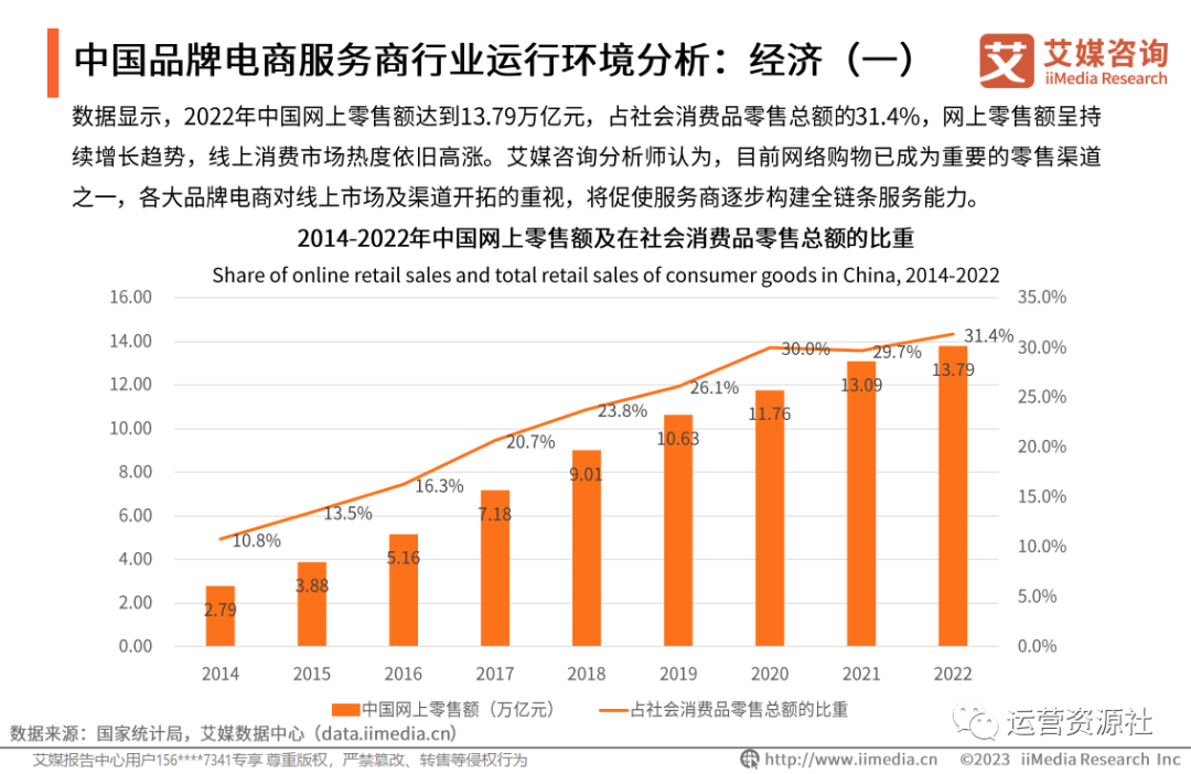 数据显示,2022年中国网上零售额达到13.79万亿元,占社会消费品零售总额的31.4%,网上零售额呈持续增长趋势,线上消费市场热度依旧高涨。艾媒咨询分析师认为,目前网络购物已成为重要的零售渠道之一,各大品牌电商对线上市场及渠道开拓的重视,将促使服务商逐步构建全链条服务能力。
