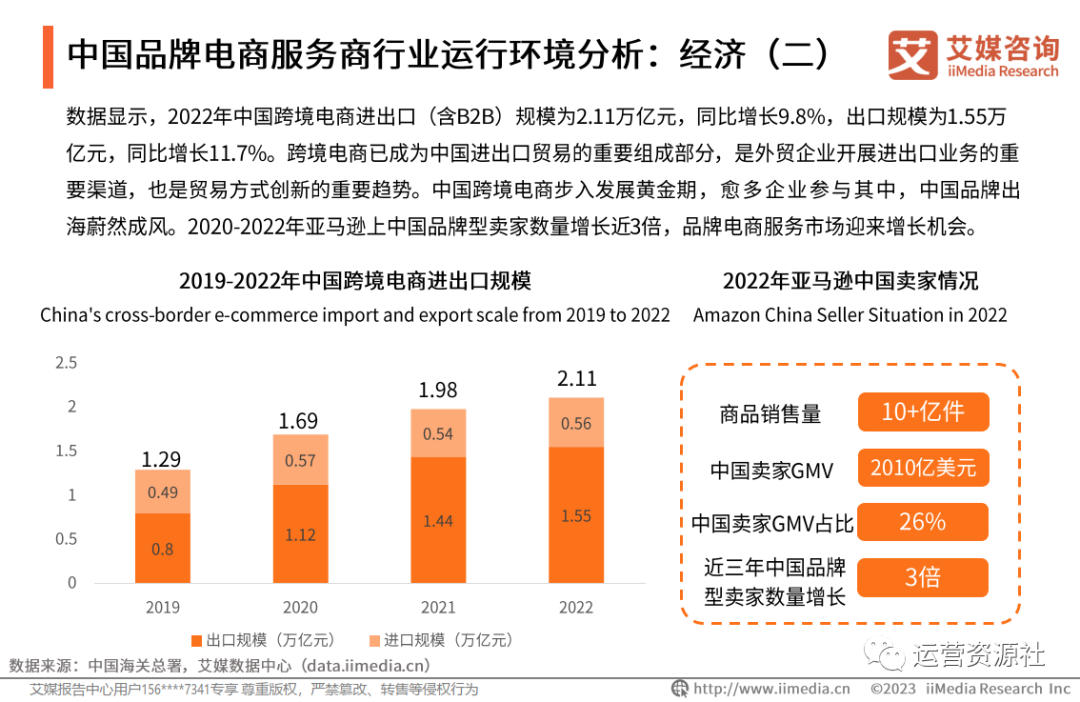 数据显示,2022年中国跨境电商进出口(含B2B)规模为2.11万亿元,同比增长9.8%,出口规模为1.55万亿元,同比增长11.7%。跨境电商已成为中国进出口贸易的重要组成部分,是外贸企业开展进出口业务的重要渠道,也是贸易方式创新的重要趋势。中国跨境电商步入发展黄金期,愈多企业参与其中,中国品牌出海蔚然成风。2020-2022年亚马逊上中国品牌型卖家数量增长近3倍,品牌电商服务市场迎来增长机会。