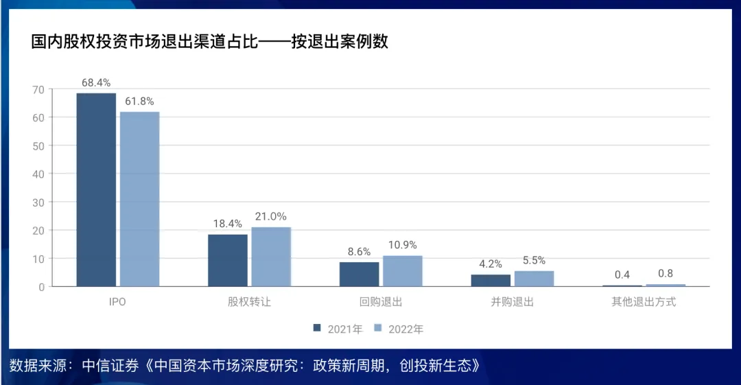 与此同时,我国私募股权投资的退出渠道相对有限,IPO发行的显性和隐性门槛较高、并购市场的成熟和活跃度不及海外,总体来说难以满足日益增长的基金退出需求。据统计,在2022年退出案例中,61.8%的数量来自IPO,尽管占比较2021年下降了6.6%,但毫无疑问IPO仍然是最主流的退出渠道。
