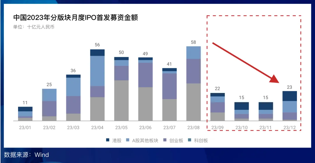 2022年IPO发行数量和募资额的下滑已经初现端倪,直至2023年8月底证监会公告阶段性收紧IPO节奏,促进投融资两端的动态平衡后,9月以来IPO首发募资额断崖式下跌,月度环比降幅62.2%。最终,2023年全年A股首发完成募集资金总额3,565亿元,同比显著下降39.2%。预计未来一段时间,IPO作为国内私募股权一级市场最主流的退出渠道,形式依旧严峻。