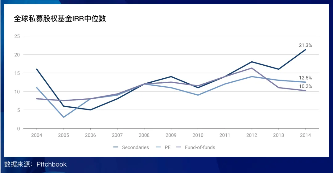 S交易不仅为市场创造了更好的流动性工具,同时也为S基金投资人创造了更稳健的回报。据统计在2004-2014年的十年间,S基金(Secondaries)以IRR中位数衡量的投资回报在大多数年份超越了母基金(FOF, Fund-of-funds)和直投基金(PE),尤其是在2008年金融危机以后,S基金回报的优越性更为凸显,IRR中位数呈现曲折上升趋势,2014年达到21.3%,而同期直投基金和母基金IRR中位数分别仅为12.5%和10.2%。
