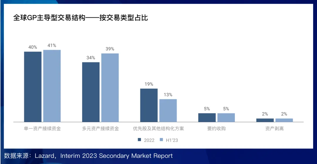 进一步,在全球GP主导型交易中,接续基金已成为最为市场接受的类型,占比超过80%。值得注意的是,单一资产接续基金几乎与多元资产接续基金的同等重要,二者在2023年上半年全球GP主导型交易中分别占比41%和39%。这意味着即使针对单个项目的退出,接续基金仍是比GP直接转让资产交易更为受欢迎的选择。