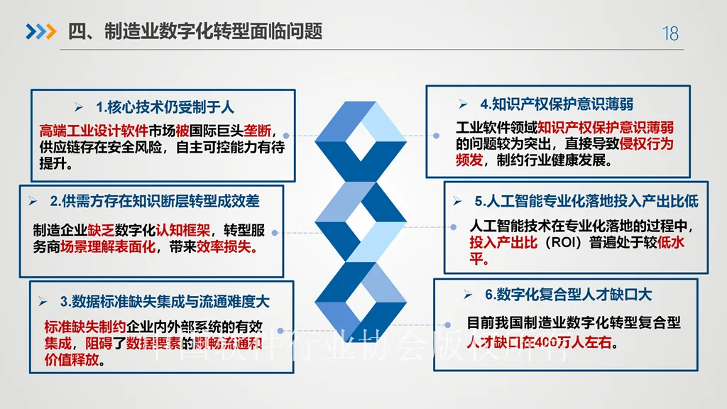 《报告》指出,尽管转型进程加速,但仍面临核心技术受制于人、供需方存在知识断层转型成效差、数据标准缺失集成与流通难度大、知识产权保护意识薄弱、人工智能专业化落地投入产出比低、数字化复合型人才缺口大等问题。对此《报告》提出三方面建议:在政府层面,应鼓励企业突破关键核心技术、聚焦不同行业及企业精准施策,在市场层面,应提高产学研合作成果转化成效、加强场景知识储备提升专业能力;在行业层面,应加强行业标准制定降低合作阻力、推广典型案例带动企业转型。