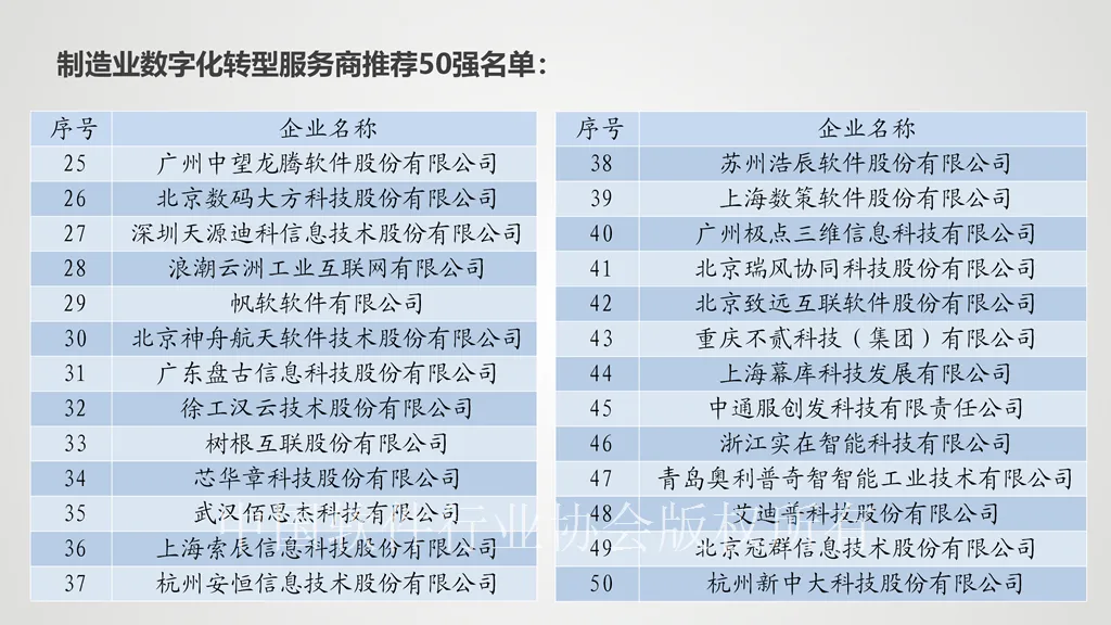 《报告》依据《制造业数字化转型服务商能力评估标准》(T/SIA061-2025),对制造业数字化转型服务商进行了深度调研,涵盖综合能力、创新能力、服务能力、生态建设能力四个维度的量化评估。通过数据分析与指标比对,最终形成“制造业数字化转型服务商推荐50强名单”。“推荐50强名单”的发布旨在树立行业标杆,引导服务商提升技术能力与服务质量,推动制造业数字化转型生态良性发展。入选企业涵盖工业软件、智能制造、工业互联网等多个领域,具备较强的综合竞争力和创新实践能力,充分体现了当前我国制造业数字化转型服务侧的核心力量与发展水平。