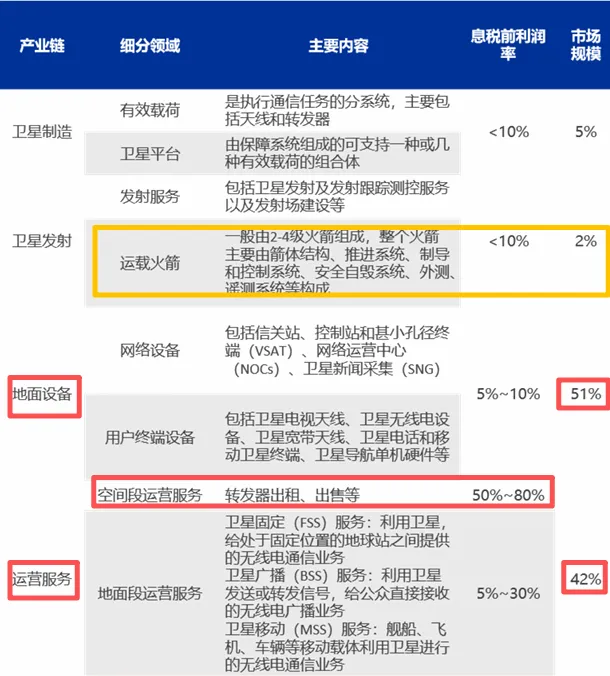 包括卫星制造、火箭发射、地面设备、运营服务。