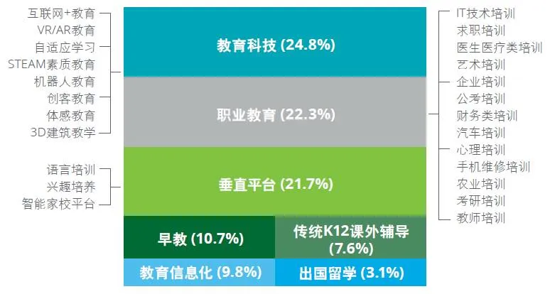 上市企业转型需求迫切,促使并购规模激增并于2016年达到峰值;新三板教育挂牌潮导致教育资产证券化数量打破历年记录;此外,教育科技领域投资已经成为投资热点。
