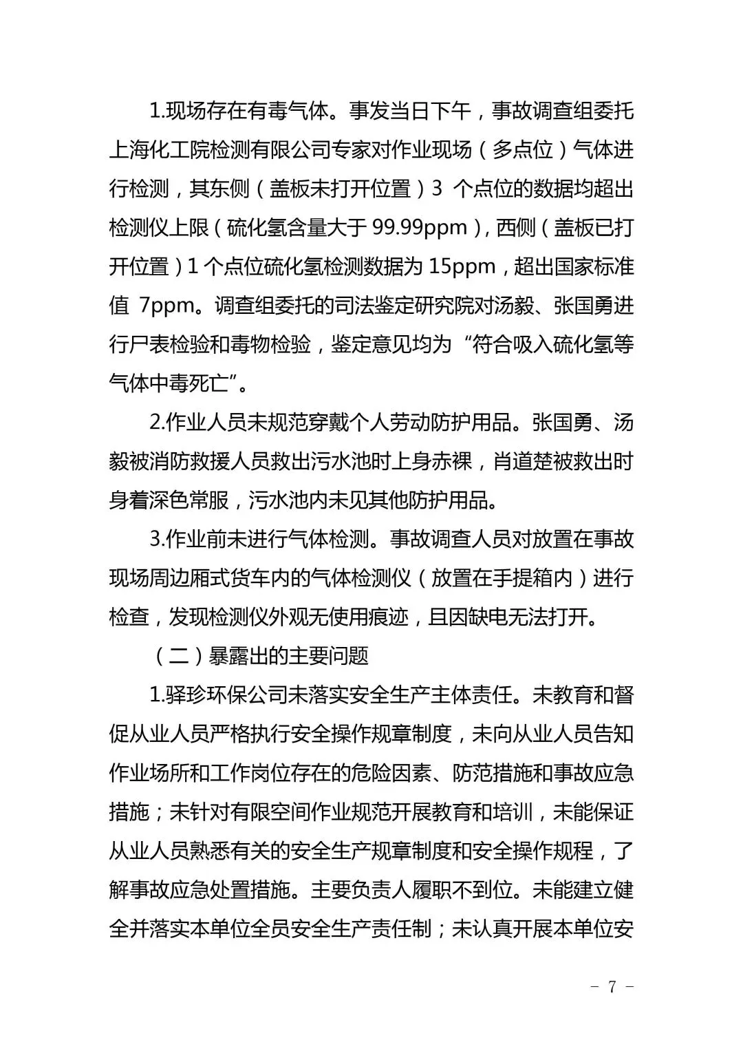 1.驿珍环保公司未落实安全生产主体责任。未教育和督促从业人员严格执行安全操作规章制度,未向从业人员告知作业场所和工作岗位存在的危险因素、防范措施和事故应急措施;未针对有限空间作业规范开展教育和培训,未能保证从业人员熟悉有关的安全生产规章制度和安全操作规程,了解事故应急处置措施。主要负责人履职不到位。未能建立健全并落实本单位全员安全生产责任制;未认真开展本单位安全生产教育和培训;未督促、检查本单位的安全生产工作,及时消除生产安全事故隐患。现场作业人员安全意识淡薄。未按照使用规则佩戴、使用劳动防护用品;未按操作规程进行有限空间作业和救援。