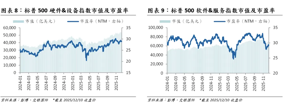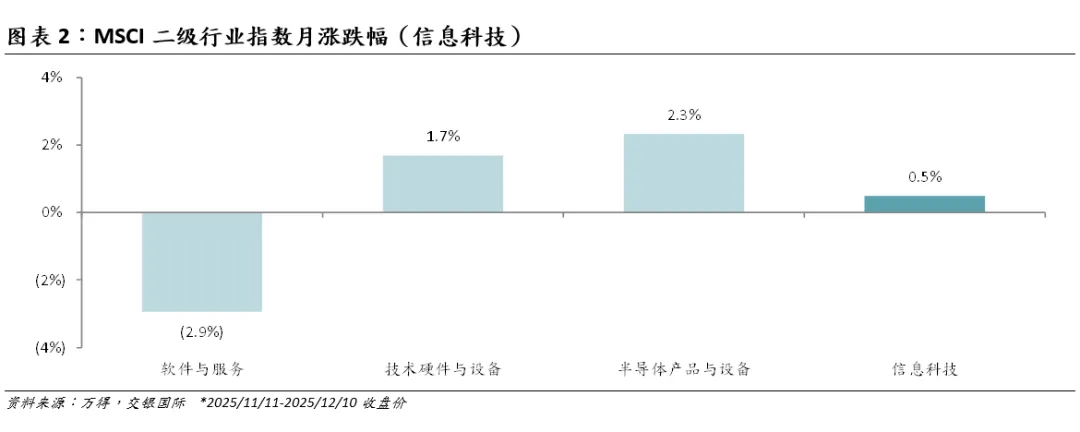 最近一个月,全球科技指数表现呈现分化。统计11月11日至12月10日,MSCI信息科技指数涨0.5%,小幅跑赢MSCI全球指数(+0.3%)。A股Wind信息技术指数逆势涨2.8%,成为同期全行业指数中唯一实现正收益的板块,而沪深300同期则录得1.3%的跌幅。摩尔线程上市后市场反应积极。港股市场或受外部波动影响,恒生指数跌4.3%;恒生科技指数跌5.8%,跌幅仅次于以大型互联网企业为核心成分的恒生传媒指数。估值方面,美股科技股估值在11月下旬普遍下跌后有所反弹,我们认为这一波动或主要来自美联储降息预期的不确定性以及对AI泡沫的市场讨论。A股申万电子/申万半导体指数市盈率均有所回升。