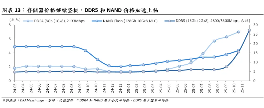 根据DRAMexchange,DDR5(16Gb)现货平均价格已从9月底的7.676美元升至11月底的27.167美元;DDR4(8Gb)和NAND(128Gb MLC)的合约平均价格也在10月继续环比上涨11%和15%。本轮存储器上行周期价格上涨幅度和时长均超我们预期。我们认为HBM存储芯片供应紧张的态势或将在2026年有所缓解,但总体存储器价格或将在2026全年保持坚挺。