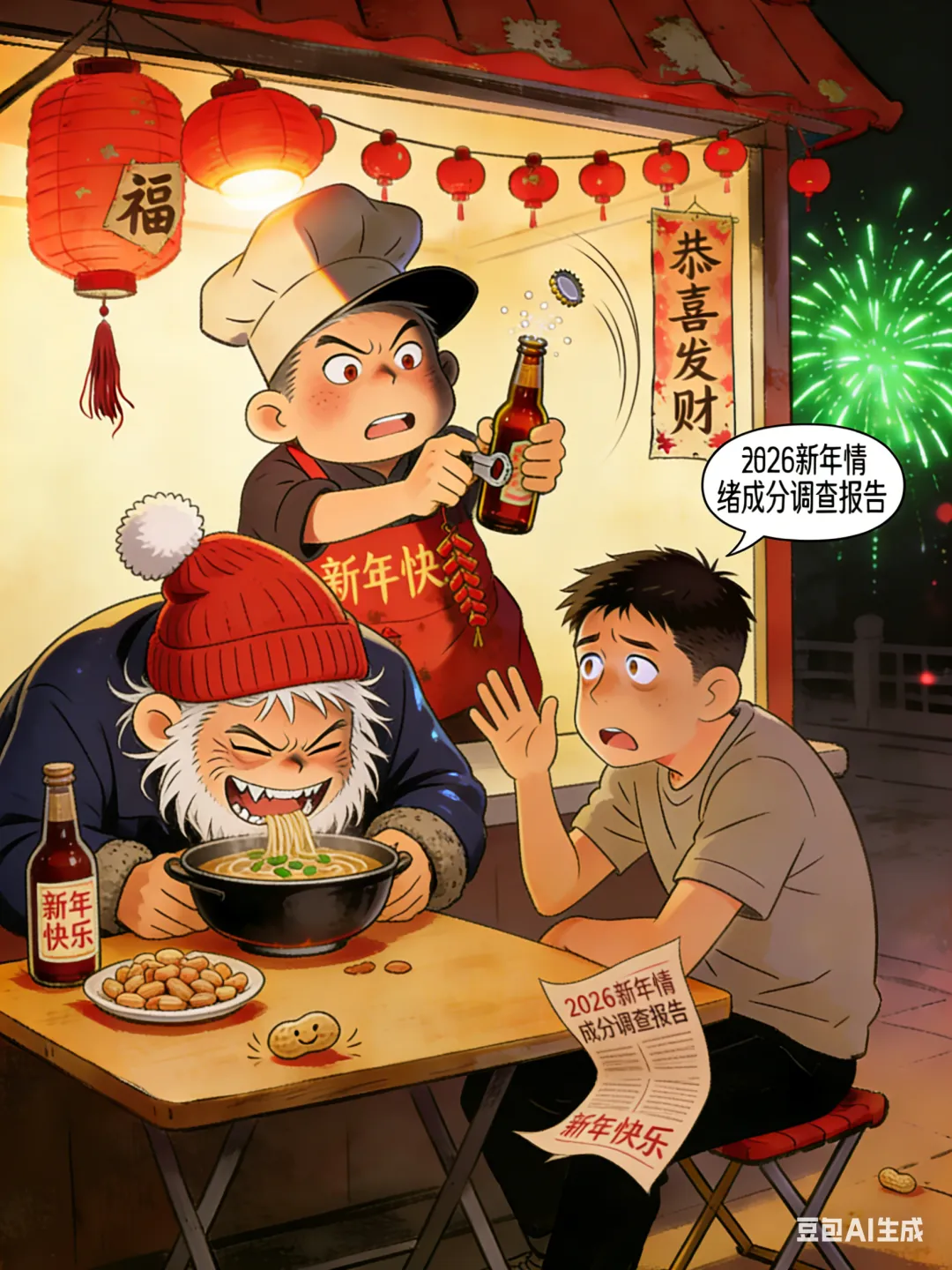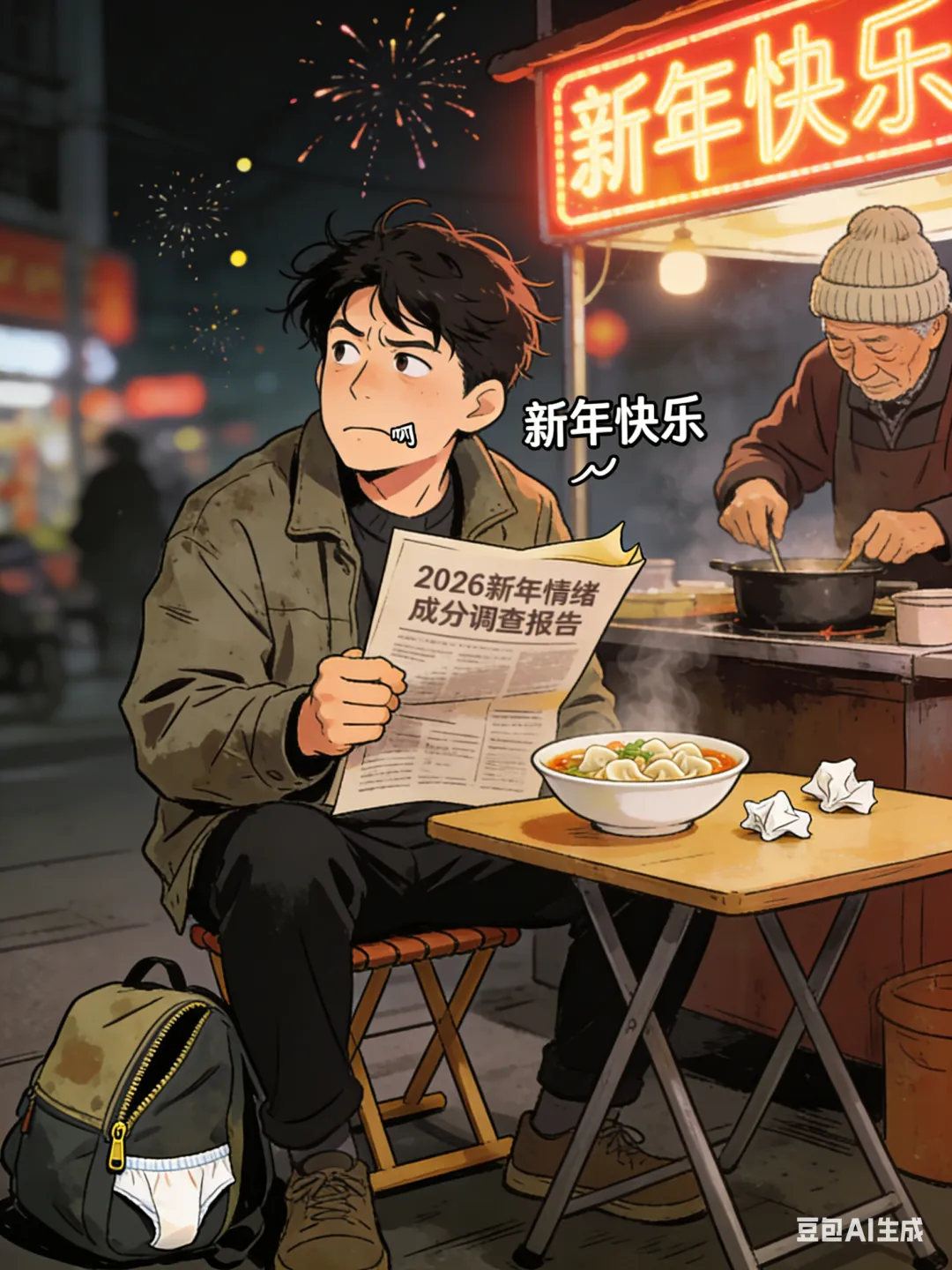 陈墨坐在路边摊,手里攥着一份名为《2026新年情绪成分调查报告》的传单。他属于那“一半人”里的“90%”——也就是说,他嘴里刚喊完“新年快乐”,心里就在盘算明天的房租和还没干的内裤。对他而言,快乐像个拼图,但他手里全是边角料。