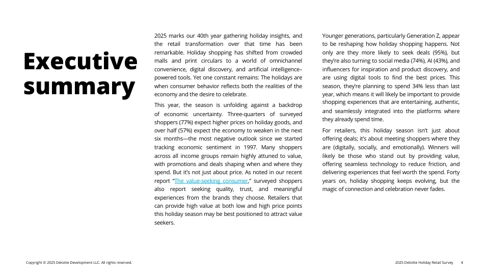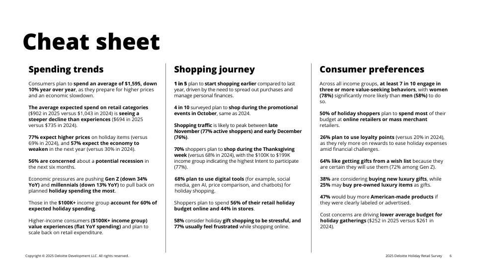 68%的人计划用数字工具帮忙省钱:比如比价网站、社交平台找折扣、甚至用生成式AI(如ChatGPT)列购物清单或找优惠; 56%的预算花在线上,44%在线下——线上仍是主力; 但77%的人吐槽“网购太让人烦躁”(比如退换货麻烦、图片与实物不符)。