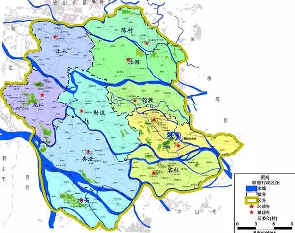 顺德位于珠三角中部,是典型的河口三角洲平原地区。这里水网密集。各类河网密度达2.12公里/平方公里。这个数值是什么概念?北京市市区五环内的道路密度,也才4.85公里/平方公里。就是说,在这走两步就能遇到河,与在别的城市遇到马路一样平常。所以,各个镇街的行政边界大多由较大的河道分割。这造成了一定交通不便,也一定程度上形成“一镇一隅”,各镇相对独立发展。空间阻隔也造成建设用地的碎片化。