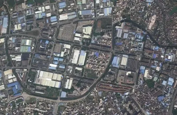 影像图:村镇、工厂、农田相邻交错的用地布局