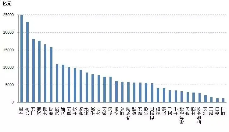 2015年,35城GDP位居前五位的城市依次是上海(24965亿元)、北京(22969亿元)、广州(18100亿元)、深圳(17503亿元)和天津(16538亿元),紧随其后的是重庆,GDP为15720亿元。一线城市和直辖市的城市地位在GDP排名中得到了充分体现。
