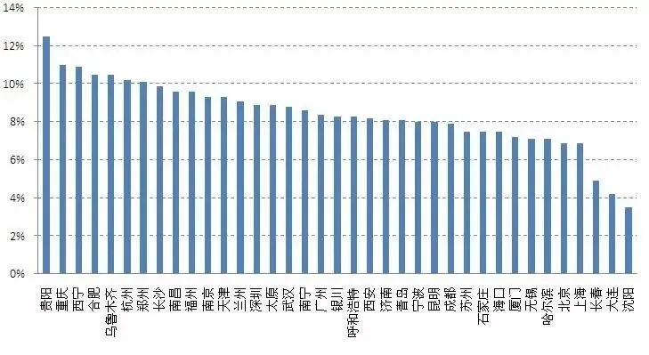 2015年,35城GDP实际增长率均值为8.4%。排名前三的城市依次是贵阳(12.5%)、重庆(11%)和西宁(10.9%)。西部的后发优势,正在体现。尤其是产业加速向西部转移,部分人口回流,都助推了经济增长。