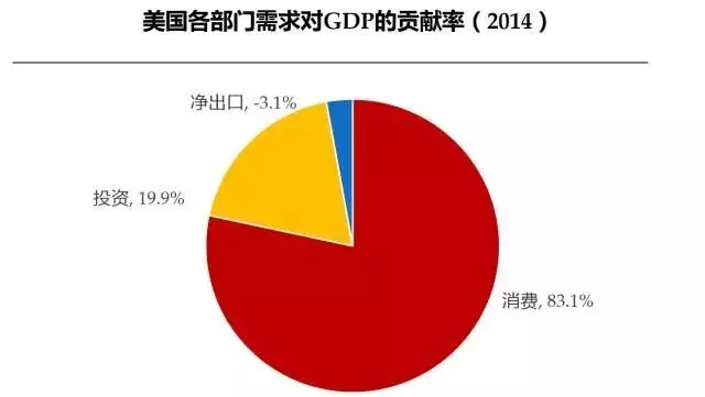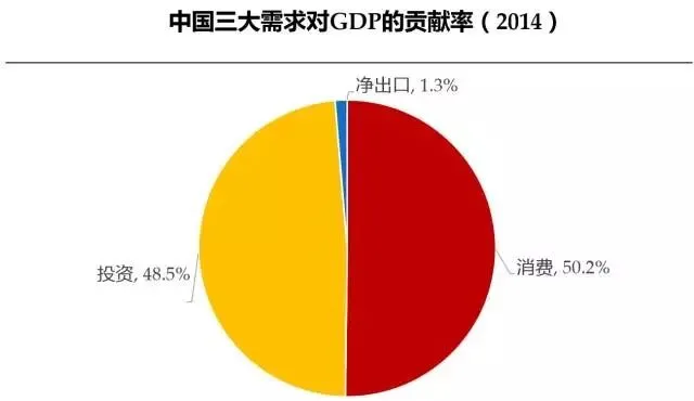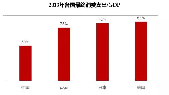 2014年,中国GDP总额63.6万亿元,美国GDP总额17.3万亿美元。与美国相比,中国经济增长“三驾马车”之一的消费支出对GDP的贡献率依然较低,仅为50%,美国为83%。与香港、日本等成熟市场相比,差距也较为明显。