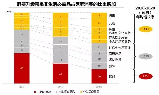 根据麦肯锡预测,受益于可负担非生活必需品消费人群的日益增加,2010年到2020年中国非生活必需品消费将保持13.4%的年平均增长率,高于生活必需品和半必需品。
