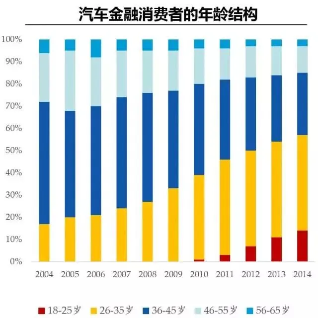 根据大众汽车金融的调查数据显示,10年前,36-45岁年龄组的汽车金融消费者占比超过50%,而到2014年,占比最高的年龄组变成26-35岁,且18-25岁人群占比逐步提升,消费年轻化趋势明显。