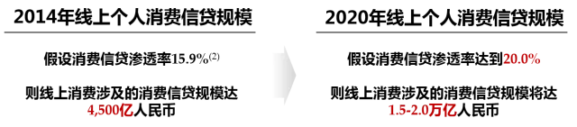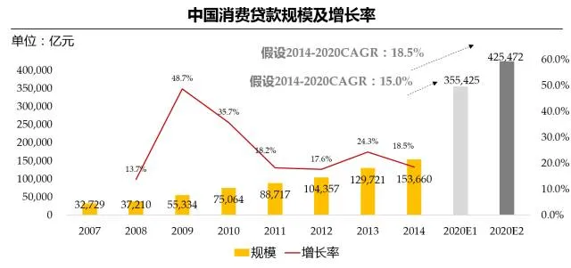 2007年至2014年,中国消费信贷规模年均复合增长率为24.7%,保守预测2014-2020年年复合增长率为15.0%,则2020年消费信贷规模超过35万亿元,若年复合增长率达18.5%,2020年消费信贷规模将超过42万亿元。