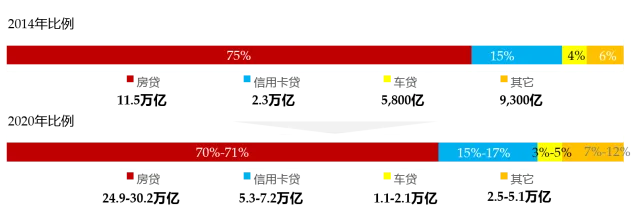 我们预测,到2020年,中国消费信贷结构大致比例为:房贷70-71%%,信用卡贷15-17%,车贷3-5%,其它7-12%。