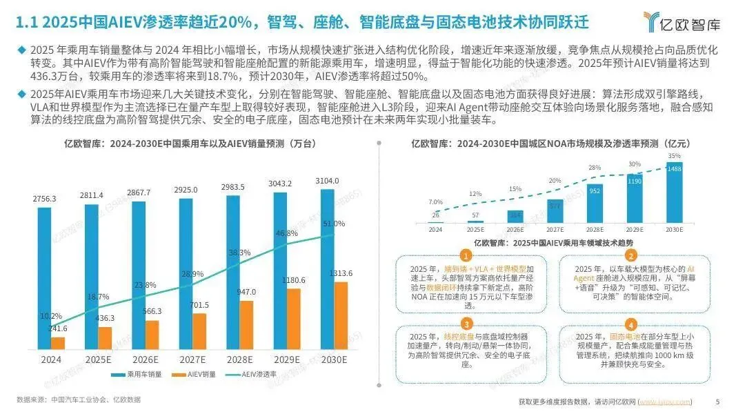 2025 年中国 AIEV(人工智能电动汽车)产业发展势头强劲。全年销量达到 436.3 万辆,同比增长 18.7%,预计到 2030 年,AIEV 市场占比将提升至 50%。