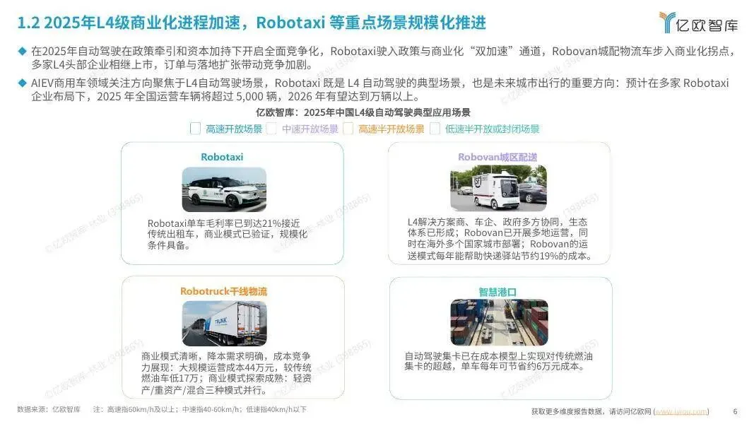 应用场景不断拓展,Robotaxi、Robovan、Robotruck 等 L4 级自动驾驶车型加速商业化。2025 年 Robotaxi 单车年均营收超 15 万元,毛利润率达 21%;Robovan 在城区配送领域需求旺盛,能帮企业年均节省成本超 23 万元。