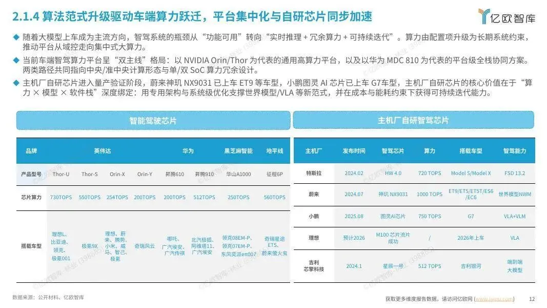 技术层面,智能驾驶成为核心突破点。VLA 智能驾驶架构广泛应用,搭配 AI Agent 技术,让 L3 级自动驾驶在更多车型上落地。主流车企纷纷升级硬件配置,英伟达、华为、黑芝麻等企业的芯片成为热门选择,算力从 200TOPS 到 730TOPS 不等,支撑起城市和高速全场景的智能驾驶功能。