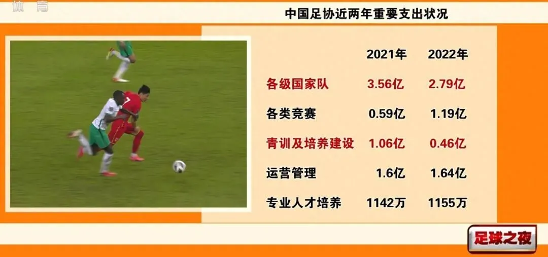 《足球之夜》报道了足协10月16日足代会内容,中国足协在会上公布了2021、2022年财务报告。