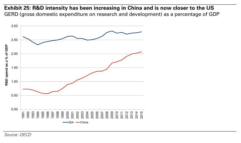 中国第十二个五年计划就提出,专注于增加价值附加链,以及推动创新。根据经济合作组织的说法,为了实现这一目标,中国的研发支出显著增加。中国研发支出在1991年以来占GDP的比例小于1%,而在2015年中国的研发支出占据GDP的比例已经超过了2%。