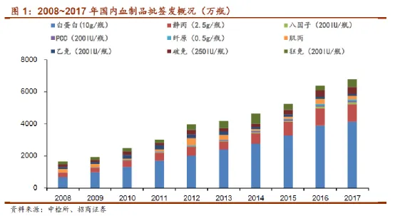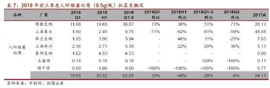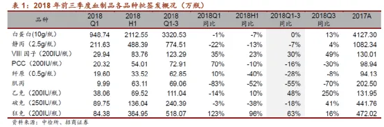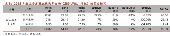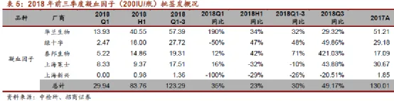2018Q1-3,凝血酶原复合物共批签发(按200IU/瓶折算)72.91 万瓶,同比-16%。其中,华兰生物批签发43.99万瓶,同比增-23%;泰邦生物批签发21.19万瓶,同比-4%。