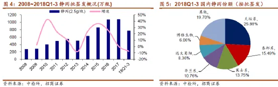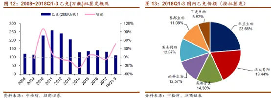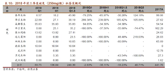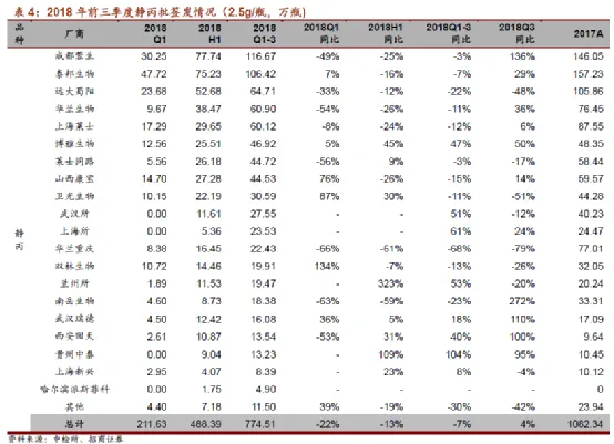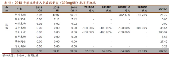 2018年Q1-3共有24家企业有批签发记录,共批签发774.51万瓶,同比增-7%。18Q3静丙批签发明显回暖,合计批签发286.12万瓶,同比+4%。