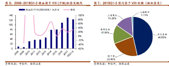2018Q1-3,凝血因子VIII(按200IU/瓶折算)批签发123.29万瓶,同比增长30%,延续2017年的快速增长的态势;18Q3 批签发39.53万瓶,同比增长49%,批签发呈加快的趋势。